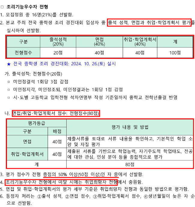 조리기능 우수자전형은 한국조리과학고등학교와